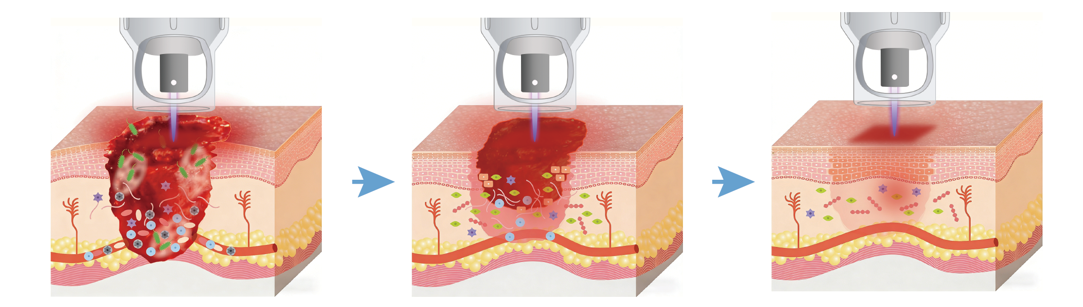 Beyond safety, the same reactive species that eliminate pathogens at higher doses act as crucial signaling molecules at therapeutic levels. This principle, known as hormesis, triggers beneficial adaptive responses in human tissue. Specifically, cold plasma stimulates key cellular repair pathways, promotes the release of growth factors (such as VEGF for angiogenesis), and helps modulate the wound immune environment. Thus, it not only clears infection but also actively creates optimal conditions for regeneration.